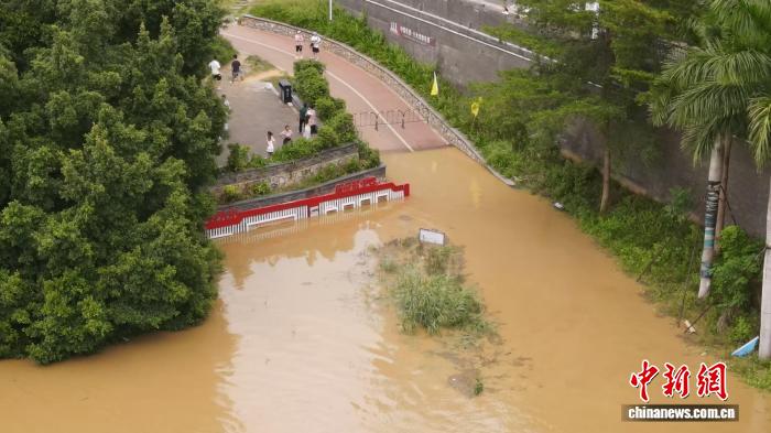 当地江滨公园部分地势低的路段被洪水淹没,临水处已架起警示栏杆。安宇 摄