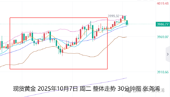 10月8日:上交易日周二(10月7日):国际黄金继续反弹走强收阳,进一步向今年6月份金价还在3400美元的时候就给出的看涨目标4000美元上方的前景迈进,目前来看,多头动力未有减弱迹象,暗示在突破4000关口之后,还将继续上行,有望冲击4100美元以及4200美元。